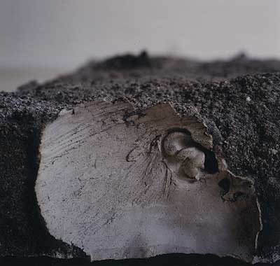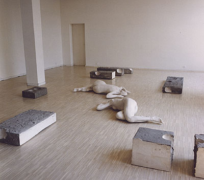 Mehrteilige Arbeit, bestehend aus zwei identischen Abgüssen des Körpers der Künstlerin und neun Quadern unterschiedlicher Größe, die den teilweisen Abdruck des Gesichtes der Künstlerin beinhalten. Die Objekte berühren den Galerieboden nicht. Sie lagern auf Holzleisten und "schweben" so ca. 3 cm über dem Grund