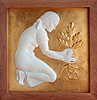 Dieses deutsche Symbol des Aufbaus und des neuen Wachstums nach dem zweiten Weltkrieg wird bei der Künstlerin zu verschiedenen Variationen umgeformt - als Relief im klassischem Weiß, mit geöffneten Händen, betend oder vor einem goldenen Hintergrund, wodurch es wie ein mittelalterliches Altarbild anmutet. Dann wird es als Serie verschwindender Reliefs durchgespielt, womit die Vergänglichkeit der Pflanze und des Lebens allgemein angedeutet sein könnte. Schließlich wird die pflanzende Frauenfigur plastisch und aufgereckt und wie ein Baum dargestellt, dann wieder zusammengekauert wie ein Embryo in einem großen aufgebrochenen Weltenei, das an Hermann Hesses Vogel Abraxas aus dem Roman "Demian" denken lässt. In einer Videoarbeit, ein Medium, in dem Ritter eher selten arbeitet, verwandelt sich die Frau schließlich tatsächlich in einen Baum - Daphne und Ovids "Metamorphosen" fallen den Betrachter ein. Mit diesen leichten, fast märchenhaften und doch zugleich bodenständigen und tief wurzelnden, weitreichenden Bildern ergeben sich Verbindungen zu einer von Sibylle Ritters früheren Arbeiten, den Untersuchungen des Grundes, mit denen sowohl der Erdboden als auch die rationale Causa gemeint sind. Wie in diesen Untersuchungen ist auch die Ausstellung in der Galerie Naumann mit der Darstellung der Pflanze und des pflegenden Menschen ein Aufruf zur Wahrnehmung und Untersuchung der Hintergründe des Lebens und des Verhaltens der Menschen in der Welt - und letztlich eine zart fühlende spirituelle Hommage an die Natur.